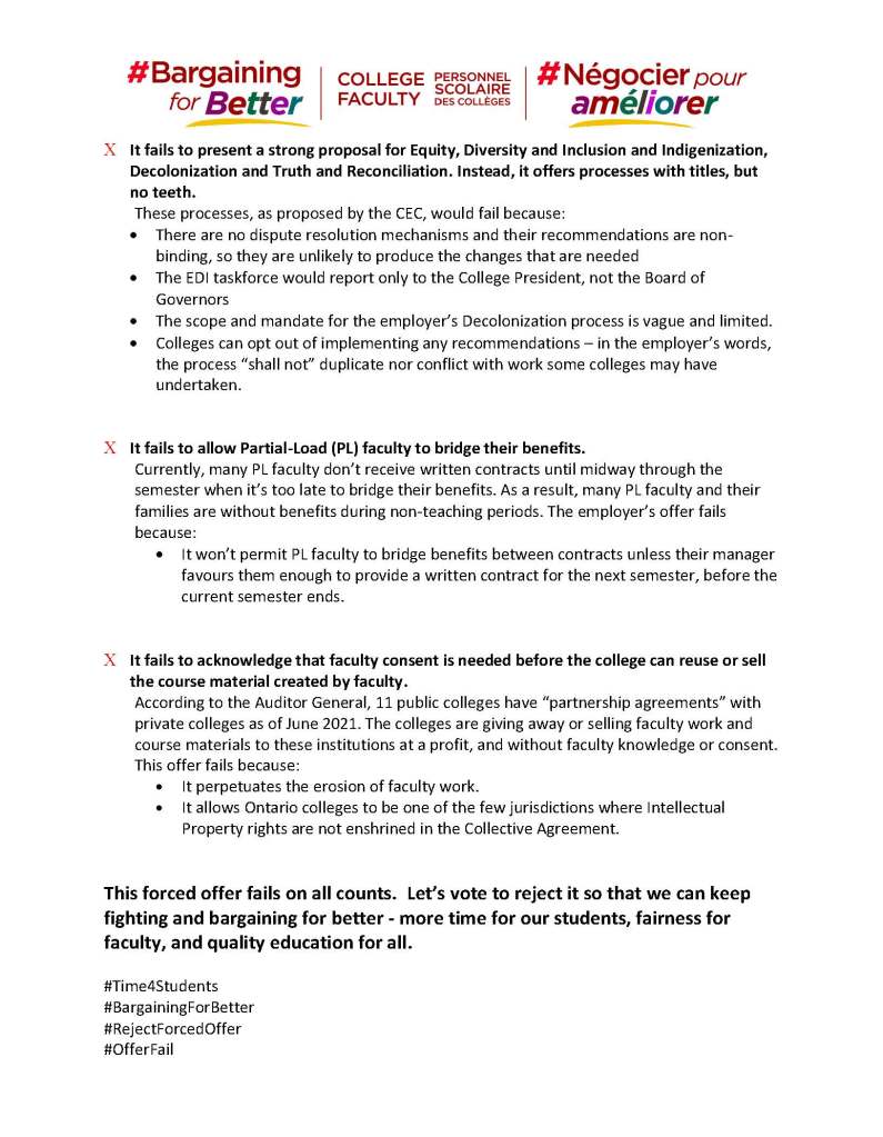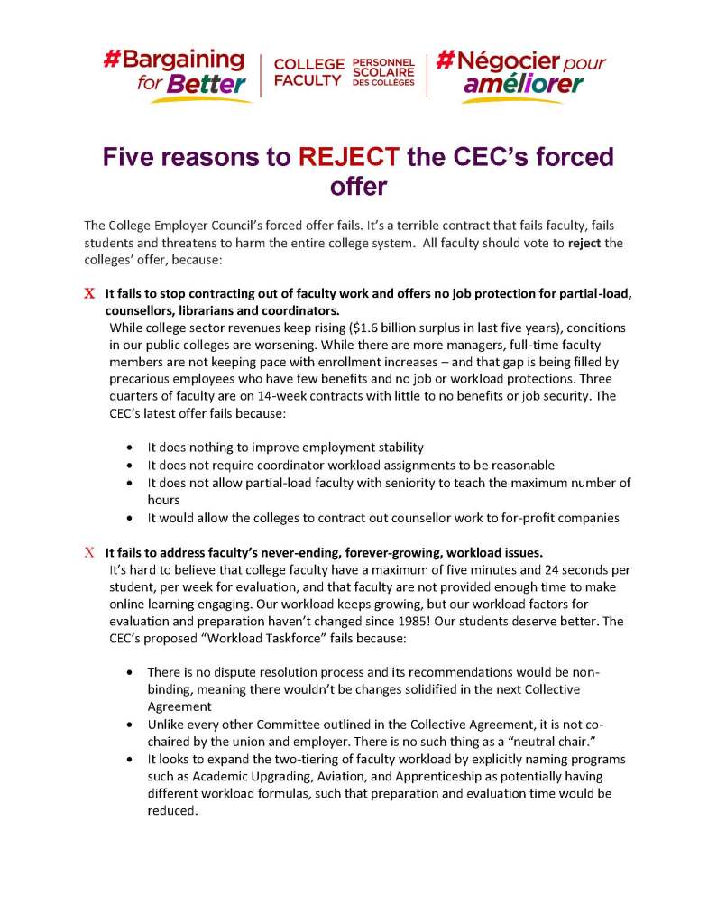 Below please find a simple reference sheet, “Five Reasons to Reject the CEC’s Forced Offer.” This document provides a quick overview for faculty on why the CEC’s offer fails to address faculty and student needs.