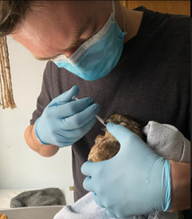 Thom Luloff is the Academic Quality Assurance Lead for Fleming College and a Professor in the School of Environmental and Natural Resource Sciences. He is also the Senior Wildlife Biologist with Kawartha Wildlife Centre, pictured here testing the equilibrium of leg strength of a Great Horned Owl and medicating a Cooper’s Hawk after head trauma following a window collision.